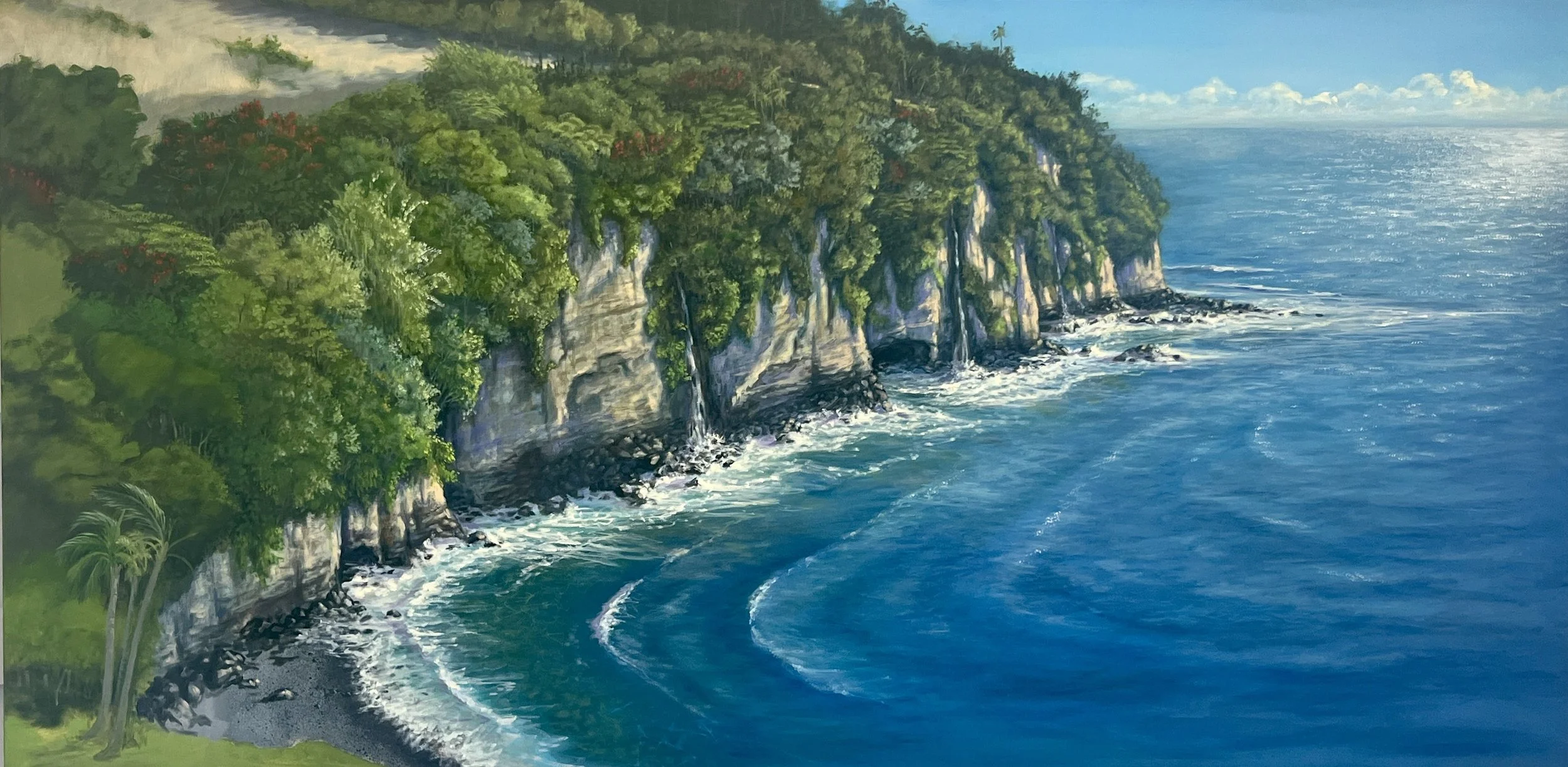 Maulua Gulch on the scenic Hamakua Coast of the Big Island is a spectacularly rugged spot. Looking down from the south side of the gulch the sparkling transparent water contrasts with the rough