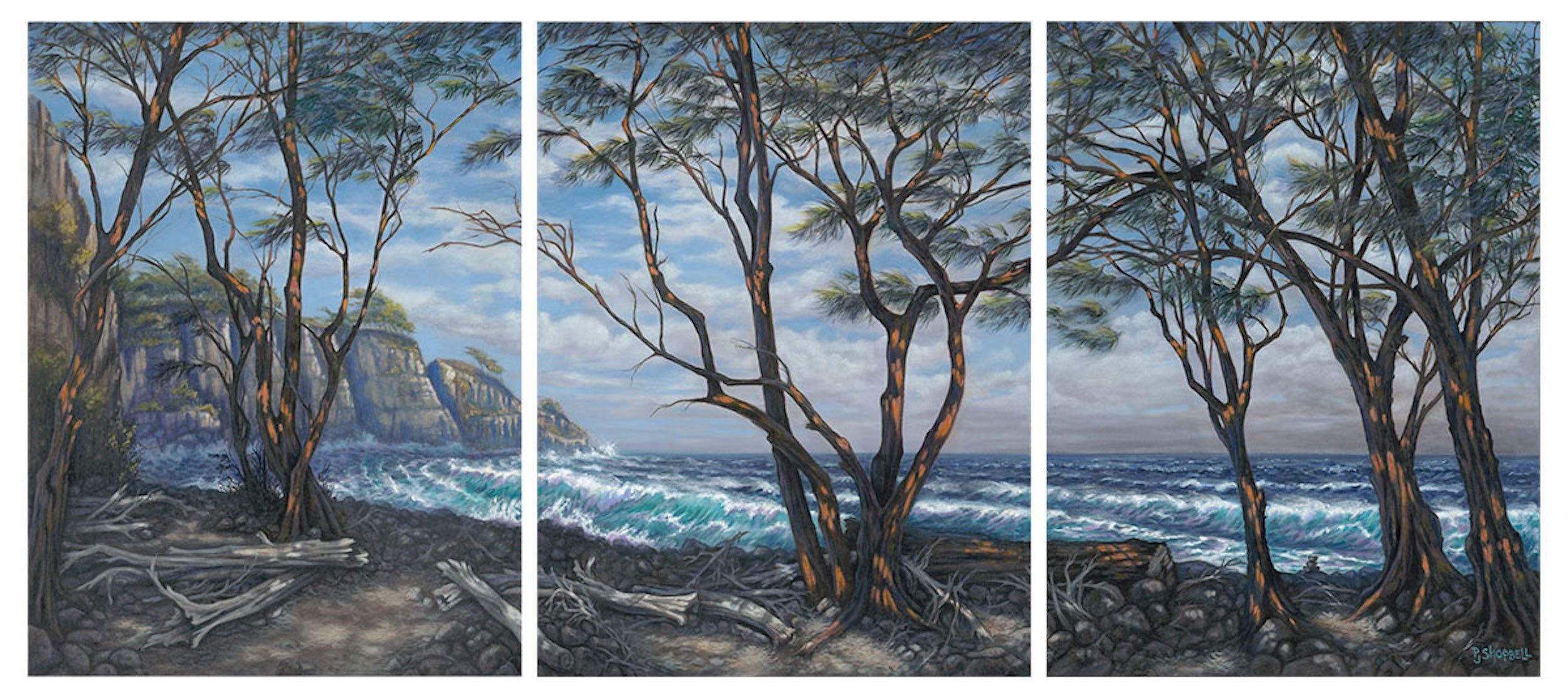 This is a beautiful spot on the far North shore of Hawaii Island. A steep, winding trail leads down to the bottom of the cliffs. You walk through a grove of twisted Ironwood trees and just over the rise is a fabulous black sand beach. A windy, rugged, magical place. This piece consists of 3 panels; each 18" x 24" x 1.5"